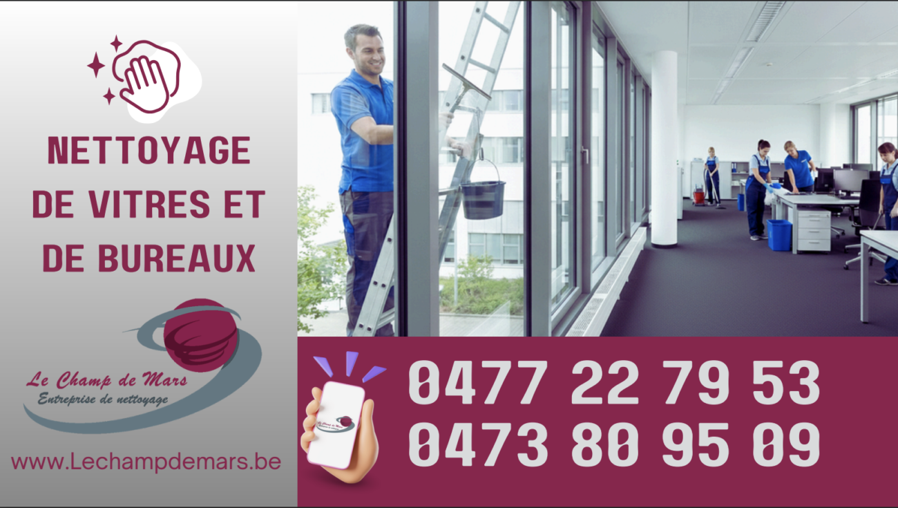 Le Champ de Mars est la référence en matière  de nettoyage et de lavage de vitres. Depuis plus de 25 ans, nous sommes spécialisés dans l’entretien régulier et le lavage des vitres des bureaux, surfaces commerciales, show-rooms, salles d’attentes, magasins, immeubles et garages. Nous sommes actifs partout en Brabant Wallon et en province de Namur.