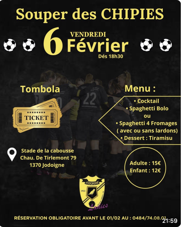 6Fév Souper des CHIPIES ven 06/02/2026 21 janvier 2026Evènements La section féminine organise son traditionnel souper le vendredi 6 février 2026 dans nos installations. Réservation obligatoire Du vendredi 06/02 à 18:00 au mercredi 21/01 à 23:30 Stade De La Cabouse, Chaussée de Tirlemont, Jodoigne, Belgique